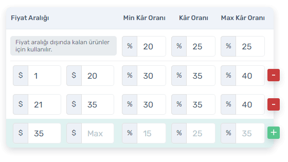 Belirli fiyat aralığında satışa sunduğunuz ürünler için genel kurallardan ayrı olarak farklı kâr oranları, minimum stok ve adet kuralı belirleyebilirsiniz.